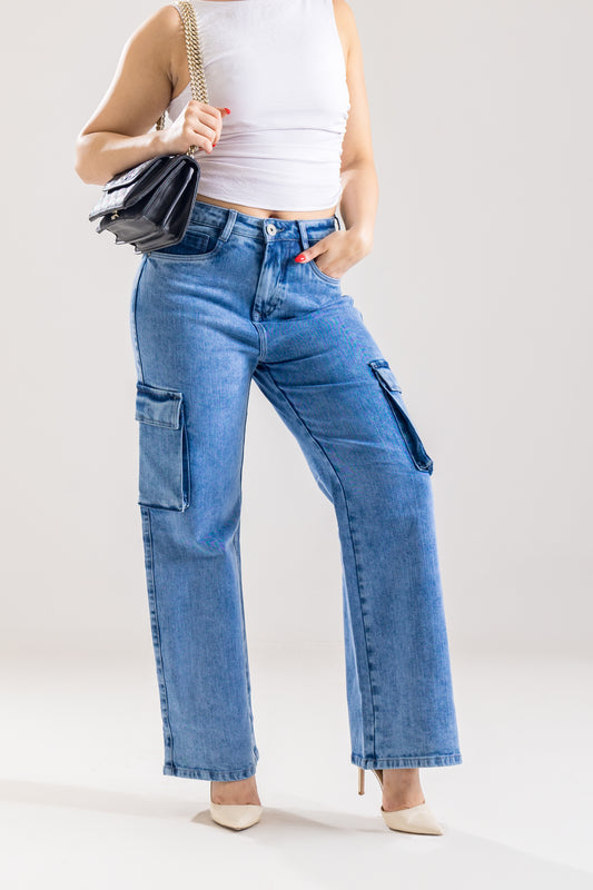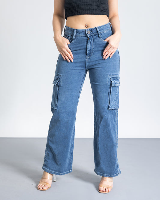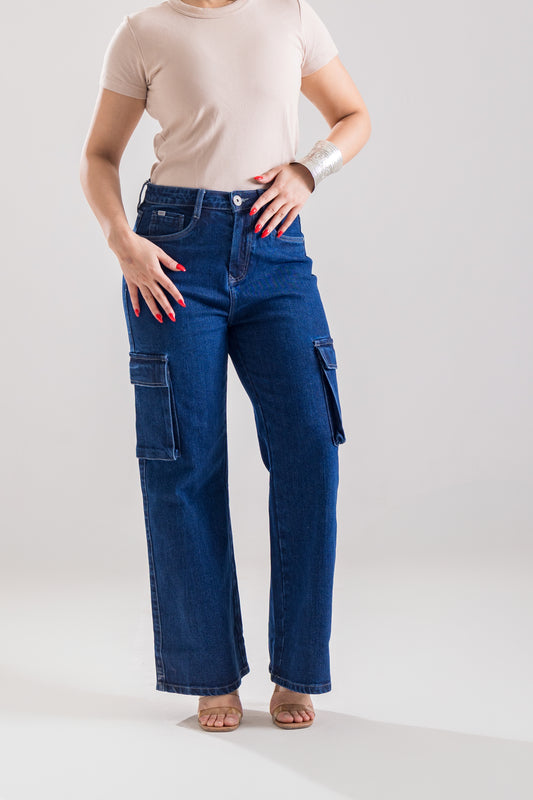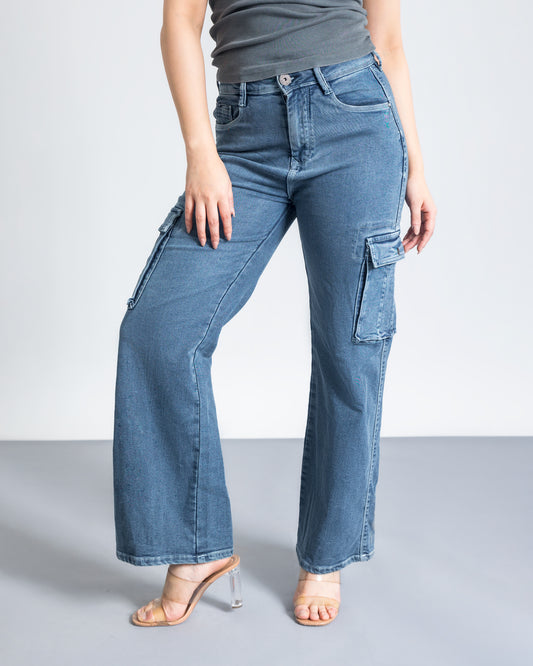 Blue Wide-Leg Cargo Jeans with Pocket Details